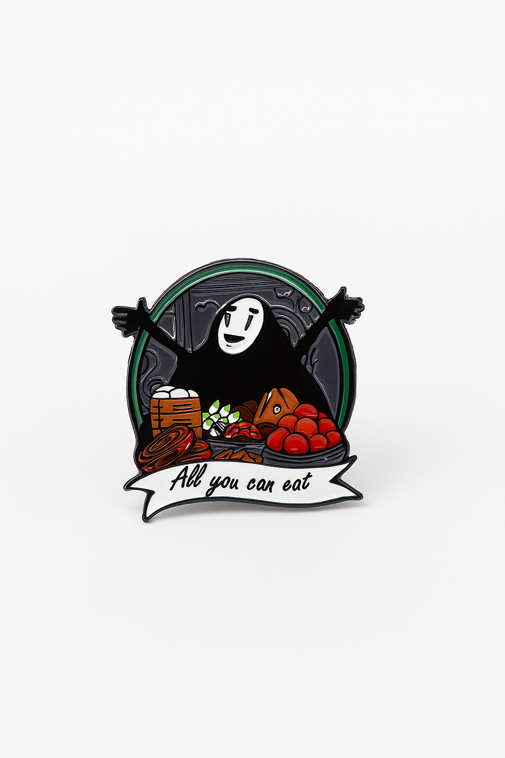 ¡Lleva la magia y el misterio de Studio Ghibli a todas partes con nuestro exclusivo Pin Esmaltado Sin Cara de El Viaje de Chihiro! Este pin de metal de alta calidad, que presenta al icónico personaje No-Face con la divertida frase ‘All you can eat’, es el accesorio perfecto para fans del anime, Studio Ghibli y la cultura otaku. Su diseño vibrante y detallado lo hace ideal para personalizar tu mochila, chaqueta, sombrero o para añadir a tu colección de pines.